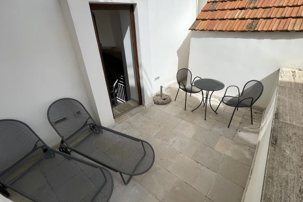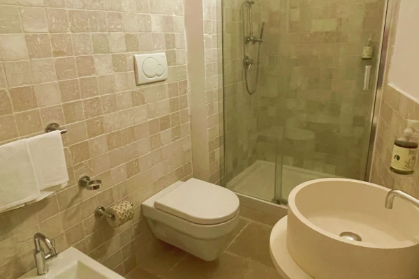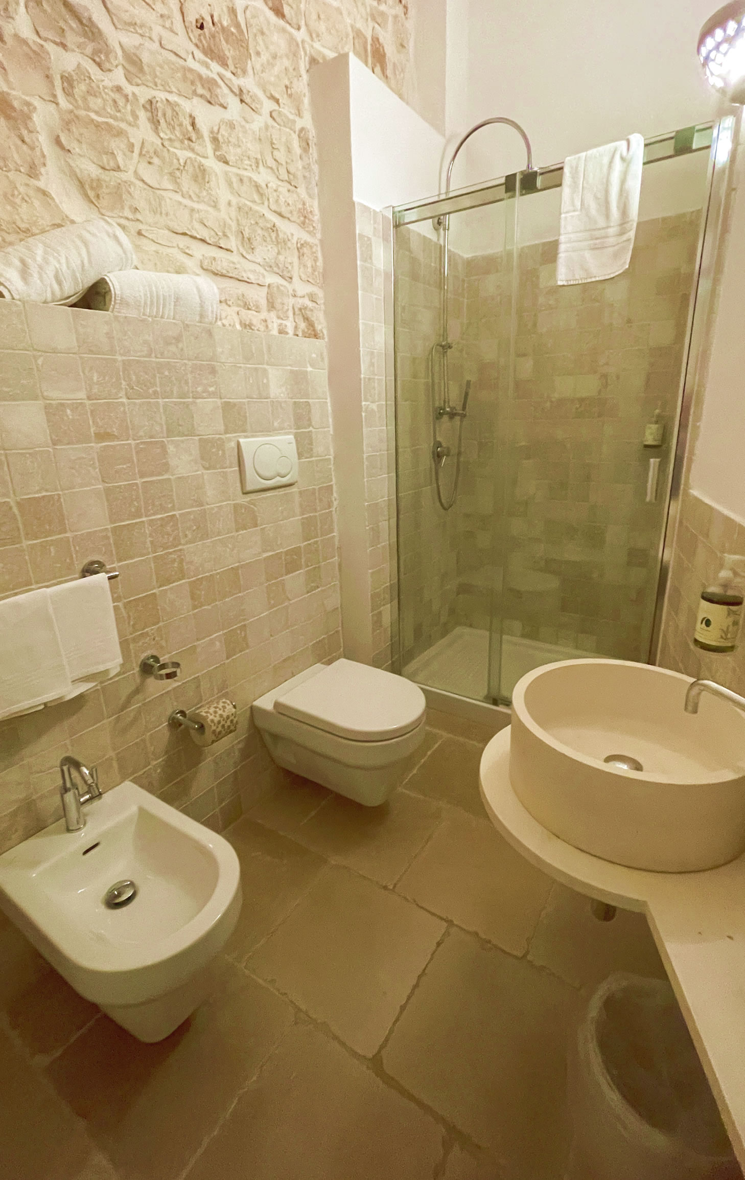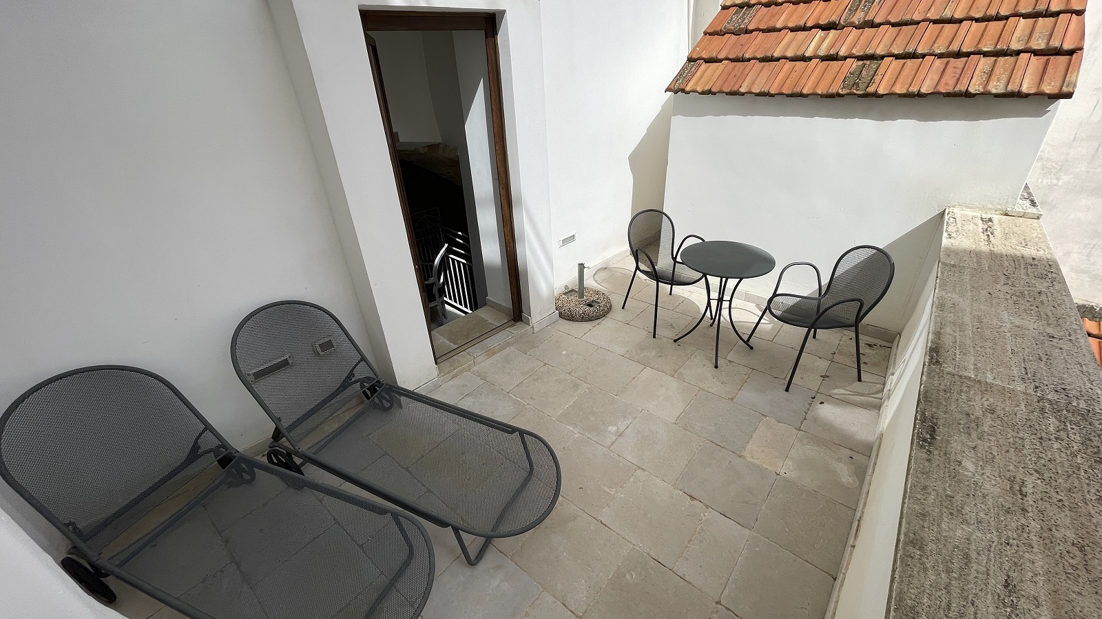 Le blanc dominant de la pierre, du plâtre et de poutres et l'hydromassage relaxant de la grande baignoire circulaire sont les caractéristiques principales de notre top junior suite avec un lit deux place.